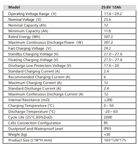 The 25.6V 12Ah LiFePO4 Battery Pack offers exceptional power with a 307.2Wh capacity and a long 2000-cycle lifespan. With fast charging capabilities, IP65 waterproof rating, and a stable output of 12A continuous discharge, this battery is designed for solar systems, RV setups, marine power, and backup systems, making it the ideal choice for both small and medium-scale energy storage needs.