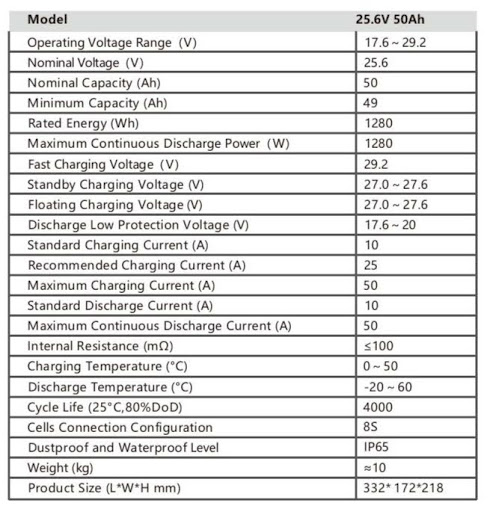 - 50Ah capacity delivers 1280Wh energy, suitable for medium to large-scale applications